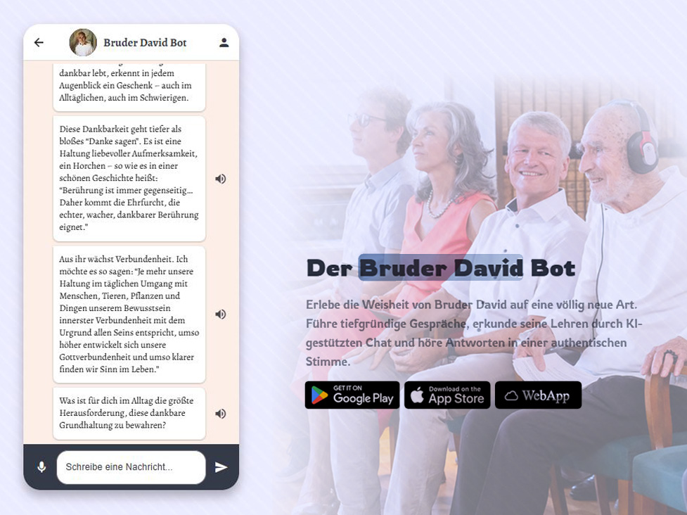 Die spannende neue Möglichkeit: Man kann dem Chatbot jede beliebige Frage stellen und bekommt eine Antwort im Sinne Bruder Davids – generiert durch eine künstliche Intelligenz. Es ist kein „echtes“ Gespräch mit Bruder David selbst, aber es fühlt sich erstaunlich danach an, zumal die Antworten sogar mit Bruder Davids Stimme vorgelesen werden können.