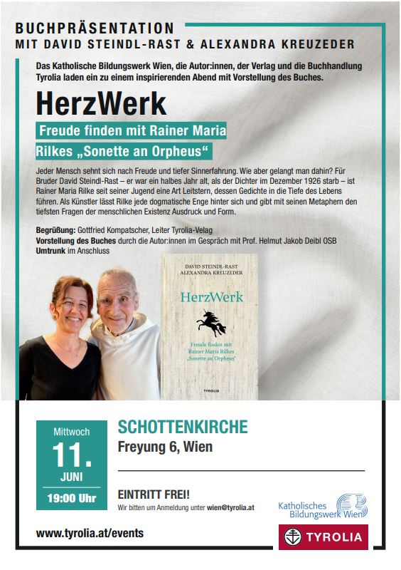 An insgesamt drei Terminen laden im Juni und Juli der Verlag Tyrolia mit Bruder David Steindl-Rast und Alexandra Kreuzeder herzlich zur Buchpräsentation von „HerzWerk“ ein: